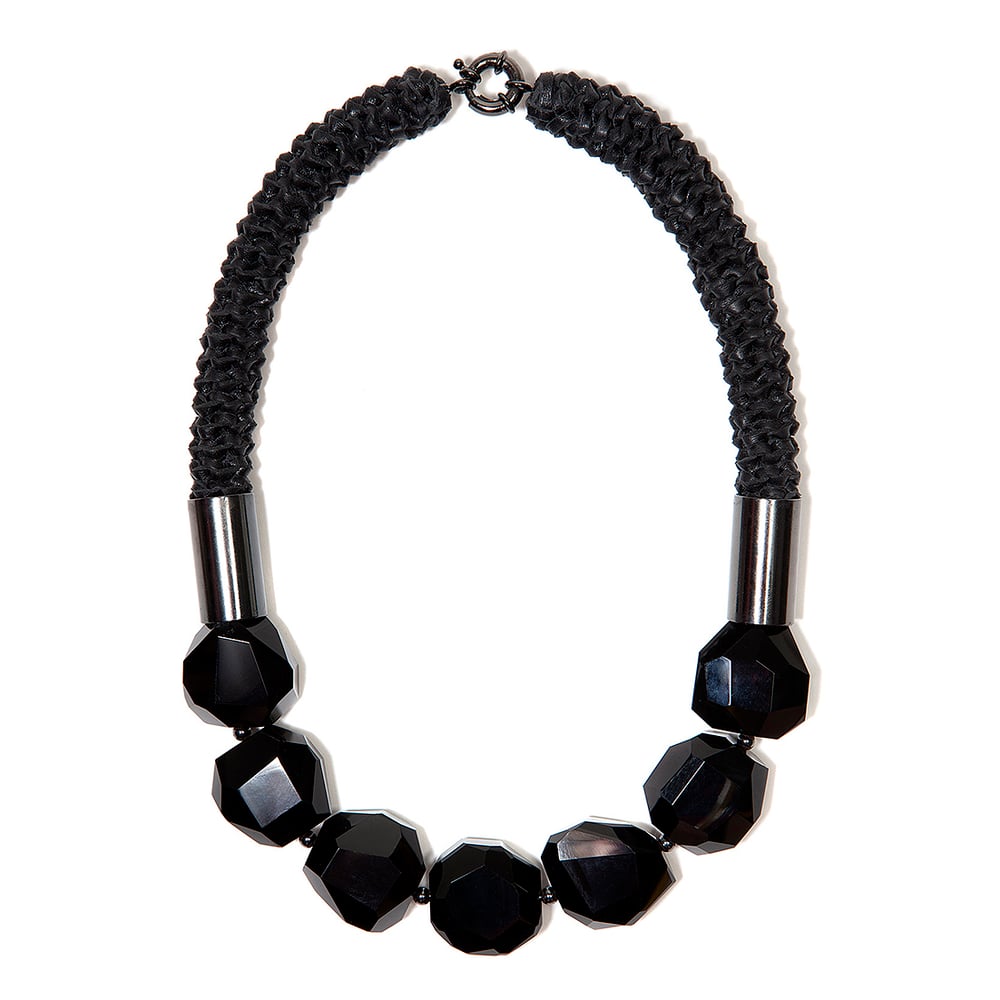 "Fracture" Black Facet Cut Brazilian Agate Neckpiece, with Woven Black Kangaroo Leather, Black Plated Tubes & Clasp.