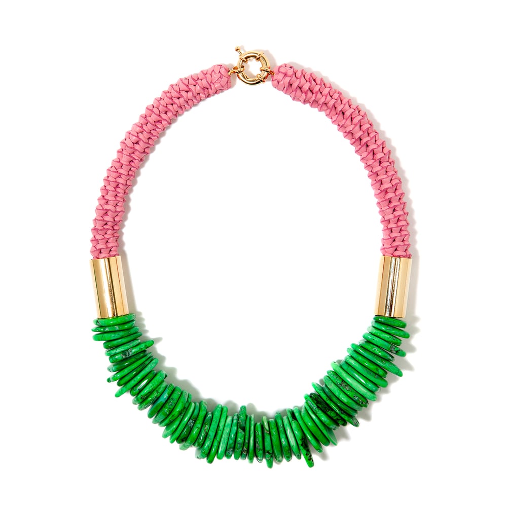 "Turin" Unique Green coloured Howlite stone neckpiece with woven pink kangaroo leather & hard gold plated tubes & clasp.